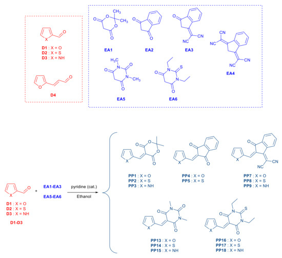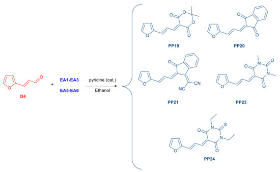 PP1–PP24 were prepared by a Knoevenagel reaction combining four electron donors D1–D4 with six different electrons acceptors EA1–EA3, EA5–EA6. Considering that piperidine can initiate an undesired nucleophilic addition on the push-pull dyes subsequent to their syntheses, pyridine was selected as the base to catalyze the Knoevenagel reaction (see Scheme 2). Synthetic procedures are detailed in the Supplementary Materials.