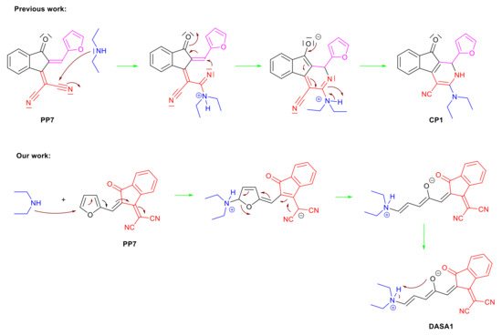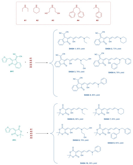 Notably, reaction yields ranging between 38% for DASA10 and 96% for DASA6 could be obtained. It should be noted that several of the Stenhouse adducts could not be obtained and our results are consistent with those previously reported in the literature [19]. One exception was noted, that of DASA1. Indeed, DASA1 could be prepared in 85% yield whereas in previous investigations [19] its synthesis was reported as being impossible. When using the same reaction conditions used with PP7 and diethylamine, Read de Alaniz and coworkers reported a nucleophilic attack of piperidine on the cyano groups of PP7, producing the cyclization product CP1 in 96% yield as the only reaction product according to the mechanism presented in Scheme 6.