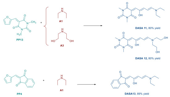 For the synthesis of the Stenhouse adducts, five different amines were investigated, namely, diethylamine (A1), piperidine (A2), diethanolamine (A3), dibenzylamine (A4), and N-methyl-benzylamine (A5). When examining the nucleophilic addition of these five amines A1–A5 to PP1–PP20, no reaction was detected for any of the dyes bearing thiophenes or pyrroles as heterocycles. This is directly related to an aromaticity increase of the order furan < pyrrole < thiophene, impeding the ring-opening reaction of pyrrole and thiophene by a nucleophile [53,54,55]. A similar behavior was also observed with PP17–PP22, despite the presence of the furyl group. In this case, no ring opening reaction could occur with the different amines due to the elongation of the spacer introduced between the furyl donor and the acceptors. As a result of this, the electron-withdrawing ability of the different acceptors was insufficient to promote the ring-opening reaction. Conversely, as expected, the nucleophilic addition of the different amines to PP1, PP4, PP7 and PP13 could proceed, promoting the synthesis of the expected Stenhouse adducts in high yields (see Scheme 4, Scheme 5 and Scheme 6).