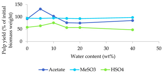 The pulp yields as a function of the water content for the three [EMim] ILs are displayed in Figure 2. Pulp yields were significantly affected by the water content when [EMim][OAc] was used under the conditions applied. The yield exceeded 100% for the 5% and 10% water content samples. This indicates that the ionic liquid was incorporated into the biomass under the studied conditions and this tallied well with the optical appearance of these pulps, which looked wet and had an increased volume (Figure 1a). Retention of excess IL was surprising, given that the pulp was washed with copious quantities of ethanol and water following the procedure outlined by Balensiefer et al. [17]. At water contents above 15%, pulp yields were around 80%, indicating a moderate amount of removal of biomass components by the acetate ionic liquid.