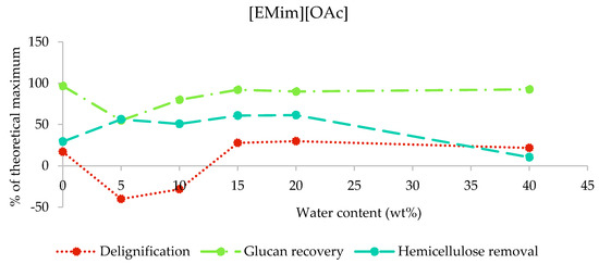However, our data for the 0–10 wt% range are somewhat different to what Doherty et al. found when pretreating maple wood with [EMim][OAc] for 12 h at 90 °C [18]. They reported a steady drop in saccharification yield as the water content increased, while we report a maximum at 5%. This could be due to the different reaction conditions (shorter time and lower temperature) and the different washing conditions. We show that only modest lignin and hemicellulose removal was observed with this IL, confirming that cellulose decrystallisation is a key enabler of increased saccharification yields, as observed by others [18,19].