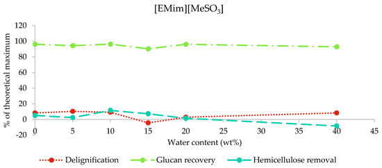 Delignification, glucan recovery, and hemicellulose removal after the pretreatment of poplar with [EMim][MeSO3] containing 0–40 wt% water for 46 h at 100 °C.