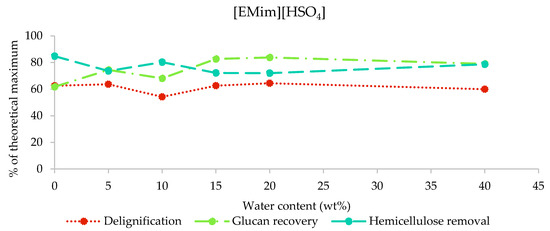 Delignification, glucan recovery, and hemicellulose removal after the pretreatment of poplar with [EMim][HSO4] containing 0–40 wt% water for 46 h at 100 °C.