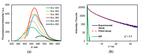 (a) Dependency of fluorescence emission of aqueous solutions of C-dots (0.1 mg/mL) upon excitation at different excitation wavelengths; (b) time-resolved intensity decay of a buffered solution (pH = 7.2) of C-dots obtained by the single-photon timing method under excitation at 340 nm.