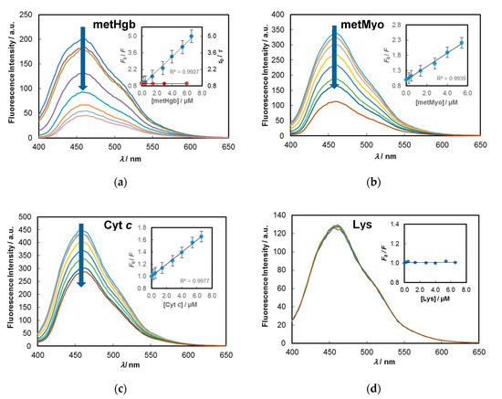The sensitivity exhibited by the cork-derived C-dots toward haemproteins was further checked against lysozyme (Lys; ~14.3 kDa; from chicken egg white), a highly basic protein devoid of a prosthetic centre. The assay showed no measurable quenching activity of Lys for C-dots fluorescence, as depicted in Figure 4d (average F0/F = 1.01; RSD = 0.69%). This result unequivocally shows that the high quenching efficiencies observed for the metalloproteins metHgb, metMyo and Cyt c, are not the results of mere aggregations of C-dots induced by the proteins followed by concomitant fluorescence self-quenching. Such nonspecific fluorophore–protein interactions have been put forward to rationalise quenching behaviours of certain conjugated polymer electrolytes (polyphenyleneethynylene and polyphenylvinylene type) in the presence of proteins [53,54], which drastically hamper their application as direct fluorescence probes of haemproteins. If the same rational were to apply to the systems under study, one would expect a significant quenching for Lys (pI = 10.5–11, [55]) which is positively charged (surface charge = +7) at pH = 7.2, and for Cyt c (pI = 9.6, [56]) which has also a highly surfaced charge (+9), compared to metHgb (pI = 6.9–7.3, [57]) and metMyo (pI = 6.8–7.4, [56]), which both have a net neutral surface charge at the working pH.