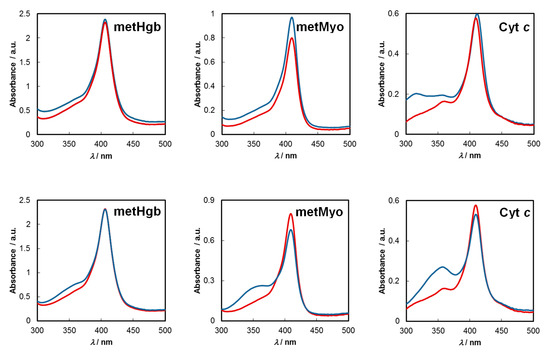 When a similar study was undertaken for C-dots/CA, different outcomes resulted (Figure 5, lower panel). Thus, while for metHgb the hyperchromic effect was only seen before 390 nm, with no change observable at the absorption maximum of the protein (406 nm), for metMyo and Cyt c increases in absorption were similarly registered from 300 to 390 nm which were then followed by hypochromic shifts in the Soret band region maxima (409–410 nm).