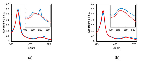 Absorption spectra of Cyt c (red line (a,b)) and Cyt c after contact with C-dots (blue line (a)) and C-dots/CA (blue line (b)); [Cyt c] = 6.6 µM, [C-dots] = 0.02 mg/mL and [C-dots/CA] = 0.005 mg/mL in buffered solutions at pH = 7.2.