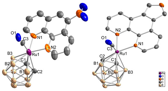 Molecule structure of [3-(CO)-3,3-(L2-κ2N,N)-closo-3,1,2-RuC2B9H11] (2) (left, only the S enantiomer is shown) and [3-(CO)-3,3-(L4-κ2N,N)-closo-3,1,2-RuC2B9H11] (4) (right) as an ellipsoid-stick model with thermal ellipsoids at 50% probability level. Solvent molecules and hydrogen atoms are omitted for clarity.