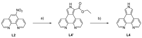 Preparation of L4 starting from 5-nitro-1,10-phenanthroline (L2) with 1,10-phenanthrolinopyrrole ethyl ester (L4’) as intermediate. a) THF, DBU, ethyl isocyanoacetate, rt, 20 h; b) EtOH, 0.2 M NaOH, 110 °C, 8 h. Yield over two steps: 54%; DBU: 1,8-diazabicyclo[5.4.0]undec-7-ene [49].