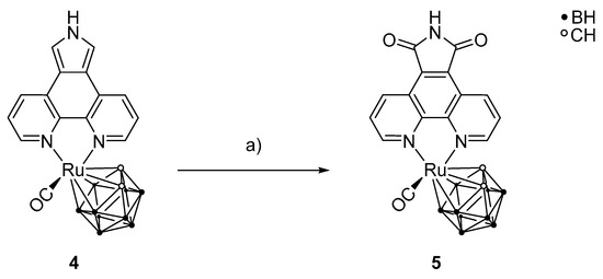 After the successful preparation of 4, a selective oxidation of positions 5 and 7 of the phenanthrolinopyrrole moiety was carried out to prepare [3-(CO)-3,3-{1′,10′-NC5H3(C(CO)(NH)(CO)C)NC5H3-κ2N,N}-closo-3,1,2-RuC2B9H11] (5) (Scheme 5). For this reaction, excess of meta-chloroperoxybenzoic acid (m-CPBA) was used. For stronger oxidizing agents, a polymerization of the pyrrole moiety is observed, and milder oxidizing agents lead to lactam scaffolds only and not to the desired maleimide groups [62,63]. Monitoring the reaction using thin layer chromatography showed that it is necessary to add the oxidizing agent successively in small portions during the reaction period. It was observed that only the ortho positions of the pyrrole moiety were oxidized, whereas the rest of the complex was unaffected.