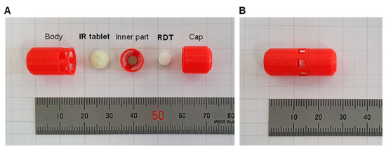 Components of the gastroretentive sustained release drug delivery system, i.e., 3D-printed capsular device, RDT, and IR tablet (A) and a final drug delivery system after assembly (B).