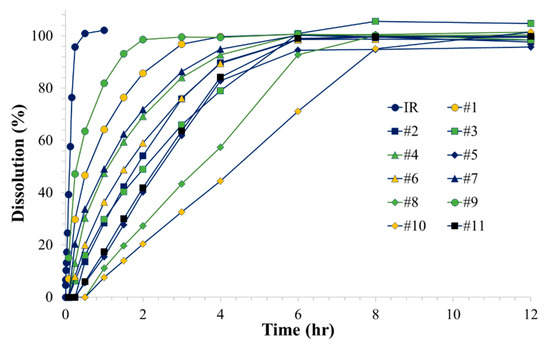 Drug release profiles of the drug delivery systems that were designed by two-level factorial experimental design were determined by the in vitro dissolution test. Figure 3 shows the obtained individual drug release profiles of 11 drug delivery systems and the intact baclofen IR tablet. Complete dissolutions were observed from all the tested drug delivery systems without significant lag time (Figure 3). The determined T80 values are summarized in Table 1. While the T80 of a baclofen IR tablet itself was less than 11.6 min, the T80 of the commercial baclofen IR tablet in the different drug delivery systems ranged from 0.95 to 6.74 h. The three drug delivery systems, i.e., No. 2, 3, and 6, which are the triplicate of a center point in the design space, would theoretically present the identical T80, but result in different T80 values, which is due solely to experimental error. From the repeated runs of the center point, the experimental error could be estimated and reflected in the model [19].