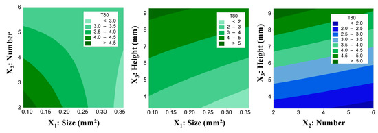 Figure 4 shows the effects of the control factors on T80 in the contour plots. T80 increased significantly with the increase in the height of the drug-releasing holes, while the size and number of drug-releasing holes had a marginal effect.