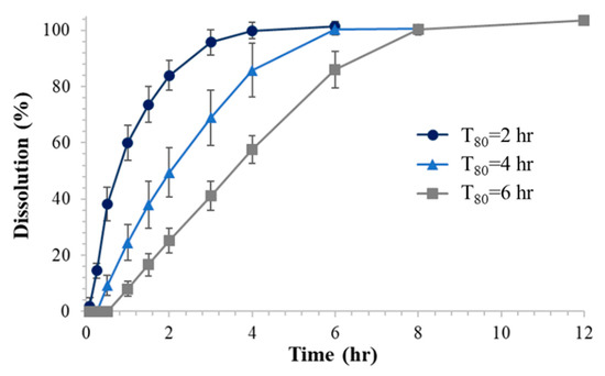Finally, based on the derived mathematical relationship between the control factors and response (T80), three types of drug delivery systems that have fast (T80 = 2 h), medium (T80 = 4 h), and slow (T80 = 6 h) drug release rates were designed by optimal solutions. The optimal settings for each drug delivery system to achieve T80 of 2, 4, and 6 h are summarized in Table 3.