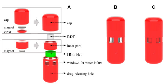 Structure of the 3d-printed gastroretentive sustained release drug delivery system that is composed of a cap with an air pocket inside and a body with windows for water influx and drug-releasing holes before assembly (A) and a final drug delivery system after assembly with the windows opened (B). After a rapidly dissolving tablet is dissolved, the windows for water influx are closed (C).