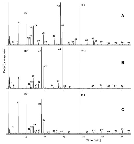 Gaschromatogram of the volatile fractions of Cruciata laevipez (A) and Galium verum flowers (B) and leaves (C). IS 1: internal standard 1 (3-methylcycohexanone); and IS 2: internal standard 2 (octadecane). For compound identification, see Table 1.