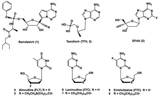 - Ohrui, H.; Kohgo, S.; Hayakawa, H.; Kodama, E.; Matsuoka, M.; Nakata, T.; Mitsuya, H. 2′-deoxy-4′-C-ethynyl-2-fluoroadenosine: A nucleoside reverse transcriptase inhibitor with highly potent activity against wide spectrum of HIV-1 strains, favorable toxic profiles, and stability in plasma. Nucleosides Nucleotides Nucleic Acids 2007, 26, 1543–1546. [Google Scholar] [CrossRef]
