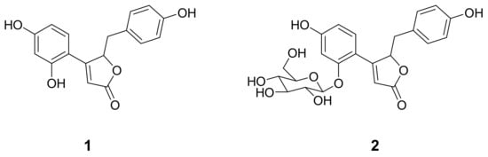 In the course of exploring a lead structure for tyrosinase inhibition, we isolated two but-2-enolides (Figure 1) from the methanol extract of the roots of A. fruticosa. Compound 1 was obtained as a yellow powder having the molecular formula C17H14O5 established by high-resolution electrospray ionization mass spectrometry (HRESIMS) (m/z 299.0843 [M]+, calcd 299.0841). The but-2-enolide functionality of 1 was deduced by α,β-unsaturated carbonyl C1 (δC 175.7) and α−position H2 (δH 6.13), which had heteronuclear multiple bond correlations (HMBC) with C3 (δC 167.1) and oxygenated carbon C4 (δC 84.4) (Figure S5). The compound 2 was elucidated as glucoside of 1. The purity of compounds 1 and 2 was evaluated by HPLC analysis (Figure S15). The spectroscopic data of the isolated compounds (1 and 2) accord with those previously published for puerol A (1) and kuzubutenolide A (2) [15,16].