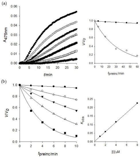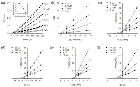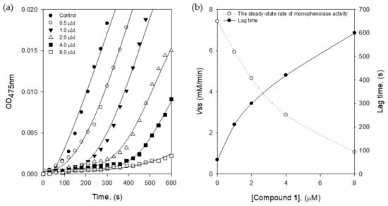 The assays were carried out using tyrosinase (260 units) and l-tyrosine as a substrate of monophenolase in 0.25 M phosphate buffer (pH 6.8) at 30 °C. The enzyme activity was recorded sequentially for 30 min by a UV spectrophotometer. To evaluate the time-dependent inhibition and the kinetic parameters of tyrosinase, progress curves with 30 s intervals were measured at different concentrations of the inhibitor and substrate. The data were through the use of Sigma Plot (SPCC Inc., Chicago, IL, USA) as a nonlinear regression program to provide the respective parameters for each curve; A (absorbance at 475 nm), vi (initial rate), vss (steady-state rate), kobs (apparent first-order rate constant for the transition from vi to vss), and (apparent Ki) in accordance with the following Equations (2)–(5) [21].