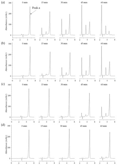 (a) High-performance liquid chromatography (HPLC) analysis of change in the content of N-acetyl-L-tyrosine (peak a, tR = 4.6 min) as a substrate for tyrosinase at different incubation times (0, 15, 30, 45, and 60 min) in the absence of compound 1. (b) in the presence of 5.0 μM compound 1. (c) in the presence of 10 μM compound 1. (d) in the presence of 20 μM compound 1.