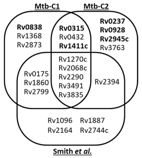- Sassetti, C.M.; Rubin, E.J. Genetic requirements for mycobacterial survival during infection. Proc. Natl. Acad. Sci. USA 2003, 100, 12989–12994. [Google Scholar] [CrossRef] [PubMed]