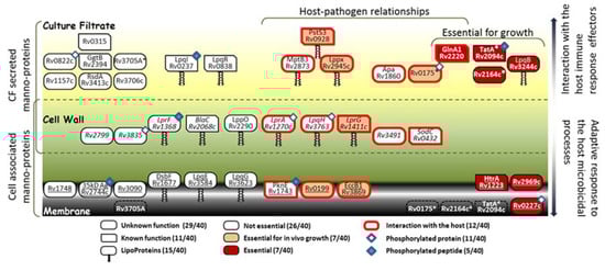 Topological distribution, essentiality and putative physiological and immunomodulatory properties of the Mtb mannoproteins identified. Mannoproteins exclusively detected in the CF and in the cell lysate (CL) extracts are depicted on the top and the bottom of the cartoon, respectively, while those detected in both fractions are represented in the intermediate space. The secreted mannoproteins detected in the CF must rather be involved in the interaction with the host immune response effectors while those more tightly associated to the envelope and detected in the CL must contribute to the bacterial fitness and to the adaptive response to the host microbicidal processes. The stars highlight the detection in the culture filtrate of glycopeptides arising from mannoproteins annotated as membrane proteins. Reported phosphorylated proteins are labeled with blue diamond and filled blue diamond when the identified glycopeptide matches with a phosphopeptide reported in literature.