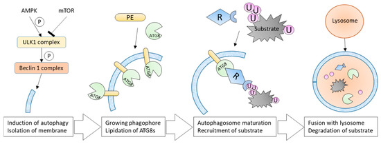 Basal level autophagy runs continuously under normal conditions [47], but stresses such as starvation, multiple infections, heat or drug treatment can strongly activate the process. The signalling pathways involved in autophagy regulation are centralized around the ULK1 (for unc-51 like autophagy activating kinase 1, also called ATG1) and Beclin1 complexes (Figure 2). ULK1 and Beclin1 phosphorylation is modulated by signalling proteins such as mTOR, Akt, AMPK and other PKA kinases. These phosphorylation steps regulate the initiation of the autophagic machinery [50]. The induction of autophagy triggers the isolation and elongation of a large cup-shaped double membrane that forms the growing phagophore (Figure 2). Although the origin of this membrane is not clear, various intracellular sources have been proposed, such as the endoplasmic reticulum (ER), the Golgi complex or the mitochondria [51]. Around 20 AuTophaGy (ATG) genes mediate the autophagy process [52]. These proteins are recruited to the phagophore and regulate the later autophagosome formation and maturation. During autophagy induction, ATG8 proteins are modified by phosphatidylethanolamine (PE). The lipidated ATG8 proteins localize at both sides of the phagophore, controlling the size of the future autophagosome [53,54]. Autophagosome maturation and the subsequent recruitment of substrates driven by ATG proteins (see below) lead to the late fusion with either vacuoles, endosomes or lysosomes (Figure 2). The autolysosome formed degrades targeted substrates using a series of lysosomal/vacuolar acid hydrolases such as cathepsins in mammalian cells. These degradation events produce small molecules such as amino acids that are transported back in the cytosol for recycling [55,56].
