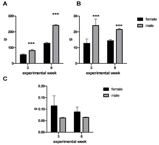 During the experiment, the body mass gain was evaluated. Male rats had significantly higher body mass gain (p < 0.001) throughout the experiment. In the third and eighth experimental weeks, food intake was monitored. Males had significantly elevated food intake (p < 0.001). However, there were no differences between male and female groups in food intake per gram of body weight (Figure 1).