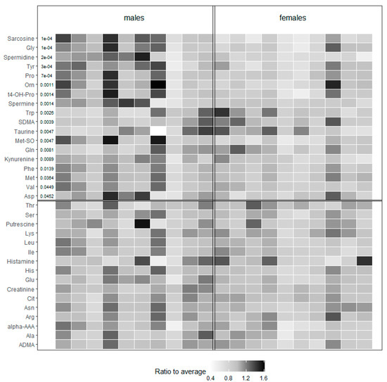 Heat map representing the values of amino acids and biogenic amines of tested male and female animals. Values of each metabolite are color-coded and represent a ratio to average. p values indicate the significance and are listed in the beginning of the corresponding line. The lines without p values are nonsignificant. Val (Valine), Tyr (Tyrosine), Trp (Tryptophan), Thr (Threonine), t4-OH-Pro (trans-4-hydroxyproline), Ser (Serine), SDMA (Symmetric dimethylarginine), Pro (Proline), Phe (Phenylalanine), Orn (Ornithine), Met-So (Methionine-Sulfoxide), Met (Methionine), Lys (Lysine), Leu (Leucine), Ile (Isoleucine), His (Histidine), Gly (Glycine), Glu (Glutamate), Gln (Glutamine), Cit (Citrulline), Asp (Aspartate), Asn (Asparagine), Arg (Arginine), Alpha-AAA (alpha-aminoadipic acid), Ala (Alanine), and ADMA (Asymmetric dimethylarginine).