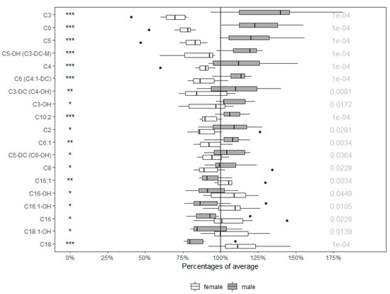 Percentages of average in acylcarnitines of males and females. Values in boxplots are expressed as ratio of each value in respect to the average. Significance is given by * p < 0.05, ** p < 0.01, and *** p < 0.001, respectively, with concrete p value at the end of the line. Orn (Ornithine), Tyr (Tyrosine), Met-So (Methionine-Sulfoxide), Gly (Glycine), Pro (Proline), t4-OH-Pro (trans-4-hydroxyproline), Asp (Aspartate), Phe (Phenylalanine), Met (Methionine), Val (Valine), Gln (Glutamine), SDMA (Symmetric dimethylarginine), Trp (Tryptophan).