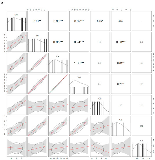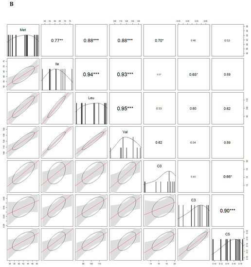 Analysis of correlations (correlograms) among levels of selected carnitines and amino acids in males (A) and females (B). The coefficients of Spearman Product Moment Correlation are reported. Significance is given by * p < 0.05, ** p < 0.01, and *** p < 0.001, respectively.