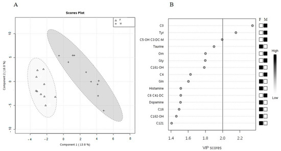 (A) Partial least squares-discrimination analysis (PLS-DA) of selected metabolites in male and female animals (PLS-DA scores’ plot includes two components: R2 = 0.93659 and Q2 = 0.44597). In the graphical output, 95% confidence ellipses for specific groups are included. (B) Variable importance in projection (VIP) plot, calculated from PLS-DA method, displays the top 15 most important metabolite features identified by PLS-DA. White and black boxes on right indicate relative concentration of corresponding metabolite in blood in descending order of importance. VIP is a weighted sum of squares of the PLS-DA loadings considering the amount of explained Y-variable in each dimension. The most important features have the VIP values of >2.0.