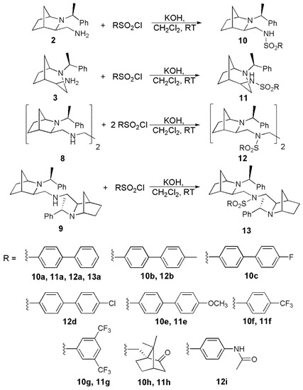 Amines 2, 3, 8, and 9 were converted into a series of sulfonamides. To this end, they were reacted with various sulfonyl chlorides in dichloromethane solution in the presence of powdered potassium hydroxide (Scheme 2). After chromatographic purification, they were obtained as crystalline solids or oils at 30–85% yield. Their structures were confirmed by spectroscopic methods (FTIR, 1H, and 13C NMR) and high-resolution mass spectrometry (data available in Supplementary Materials). In this way, enantiomerically pure derivatives 10 and 11, differing in the size of the bicyclic skeleton and the distance of sulfonamide function from the chiral scaffold, were obtained together with compounds possessing two 2-azanorbornane subunits and one (13) or two (12) sulfonamide fragments. The introduced substituents included biphenyl (10a-13a), substituted biphenyl (10b-10e, 11e, 12b, and 12d), trifluoromethylated phenyls (10f-g, 11f-g), chiral camphoryl moiety (10h, 11h), and acetamide derivative (12i, 13i). The choice of these groups was substantiated by their presence in various drugs and therapeutics. Besides full spectroscopic characterization, structures of derivatives 12a and 12d were additionally confirmed by X-ray crystallography (structures shown in Supplementary Materials). We further investigated the impact of the sulfonamide structure on their cytotoxicity.