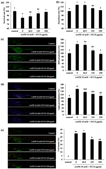 - Kim, E.A.; Lee, S.H.; Ko, C.I.; Cha, S.H.; Kang, M.C.; Kang, S.M.; Ko, S.C.; Lee, W.W.; Ko, J.Y.; Lee, J.H.; et al. Protective effect of fucoidan against AAPH-induced oxidative stress in zebrafish model. Carbohydr. Polym. 2014, 102, 185–191. [Google Scholar] [CrossRef] [PubMed]