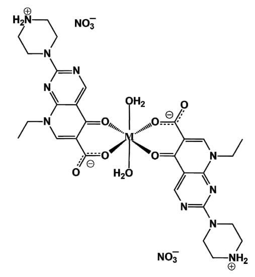 - Efthimiadou, E.K.; Sanakis, Y.; Katsaros, N.; Karaliota, A.; Psomas, G. Transition metal complexes with the quinolone antibacterial agent pipemidic acid: Synthesis, characterization and biological activity. Polyhedron 2007, 26, 1148–1158. [Google Scholar] [CrossRef]