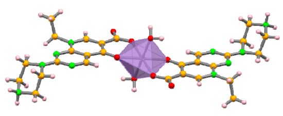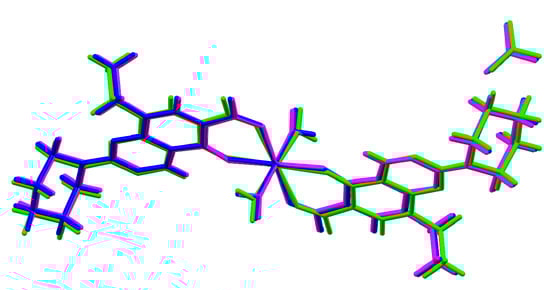 The overlap of the three structures (Figure 4) and the powder X-ray diffraction analysis (see Supplementary Materials Figure S1) clearly reveals the similarities of the crystal structures, with complex III presenting slightly higher deviations. These deviations are due to the slightly longer coordination distances to the metal centres (2.093(3), 2.181(3) and 2.205(4) Å for complex I, 2.015(3), 2.109(2) and 2.129(3) Å for complex II and 2.251(4), 2.322(3) and 2.353(4) Å for complex III (see Table S1 in Supporting Information for detailed bond distances and angles), which is most likely influenced by the larger atomic radii of calcium.