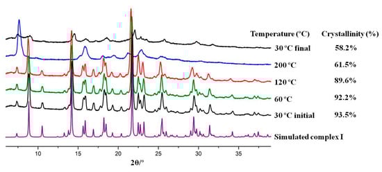 Variable temperature powder X-ray diffraction (VT-PXRD) studies were conducted to further complement the thermal characterisation of these compounds. The three complexes undergo some structural changes and loss of crystallinity at temperatures above 120 °C (see Table S3 in Supplementary Materials). However, except for complex I, the pure initial form is obtained when returning to 30 °C and the crystallinity is recovered (see Figures S12–S14 in Supplementary Materials). For complex I (Figure 8), a different pattern corresponding to a form with low crystallinity (~58%) is detected when returning to room temperature.