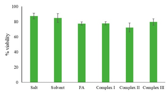 Graphical representation of the viability of Artemia salina after 24 h in the presence of 8 µg/mL of complexes I, II and III. PA = pipemidic acid. Sample solvent = DMSO (0.08% v/v).