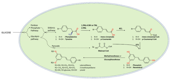 In most of the microbial systems, the primary energy source is glucose that enters in the cell and is sequentially transformed towards the biosynthesis of aromatic amino acids, the starting molecules of phenylpropanoid metabolites. The significance of stilbenes on plant and human welfare [10] resulted in the proposal of a diverse array of strategies employing recombinant DNA technology to bio-transform simple and cheap precursor molecules to the more complex core molecule of resveratrol and its derivatives [117]. Since the first attempt at overexpressing pivotal genes of the phenylpropanoid metabolism in Escherichia coli [121], or the first attempt at producing resveratrol heterologously [106], a plethora of works has been reported either to produce resveratrol or natural and unnatural forms of it [10,11].