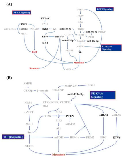 The third signaling pathway that is involved in PCa BM is the phosphoinositide 3-kinase (PI3K)/Akt signaling cascade, which originates from the activation of the epidermal growth factor (EGF) and vascular endothelial growth factor (VEGF). In general, the activation of EGF and VEGF receptors (EGFR and VEGFR) stimulates the Ras/Raf/MAPK kinase (MEK)/MAPK signaling cascade, which is involved in tumor progression or the PI3K/Akt/mammalian target of rapamycin (mTOR) cascade that promotes cell growth and the EMT [27,28]. In PCa, EGF signaling accompanies alterations in miR-96 and miR-30 expression, which act contrary to each other. EGF signaling promotes miR-96 expression, which attends to the degradation of E26 transformation-specific variant 6 (ETV6, also known as TEL, a transcriptional repressor in regulating embryonic and hematopoietic cell proliferation) that blocks the expression of the TWIST1 oncogene [29,30,31,32]. Kao et al. reported that EGF signaling inhibits miR-30 expression, which directly reduces ETS-related gene (ERG) expressions [33]. In addition to EGF signaling, miR-30 can also be reduced by Src/STAT3, which is mediated by the VEGFR/NRP-1/c-Met/Mcl-1 cascade [33,34]. When tracing upstream of VEGF signaling in PCa metastasis, reprogramming of glucose metabolism was identified as a critical step for the EMT [35]. The core regulator of glucose metabolism, AMP-activated protein kinase (AMPK), triggers cell migration-inducing protein (CEMIP) overexpression through the AMPK/glycogen synthase kinase 3β (GSK3β)/β-catenin cascade for which CEMIP mediates VEGF and MMP-2 upregulation and subsequently results in anoikis resistance [36]. In addition to AMPK, VEGF expression can also be modulated by HIF-1α. The RTK signaling cascade promotes mTOR phosphorylation, which elevates HIF-1α expression [37]. Furthermore, HIF-1α triggers pyruvate kinase M2 (PKM2) as a transcription factor that stimulates neuroendocrine markers, like oct4 and VEGF [38,39]. The EMT can be activated by PI3K/Akt- and MAPK-mediated mTOR activation, which promotes EMT and metastasis through the phosphorylation of eukaryotic translation initiation factor 4E-binding protein 1 (EIF4EBP1) [40,41,42]. Bi et al. and Tang et al. demonstrated that miR-153 and miR-133a-3p are involved in PCa BM, in which miR-153 exacerbates the EMT through inhibiting phosphatase and tensin homolog (PTEN), and miR-133a-3p acts inversely through reducing growth factor receptor expressions [41,43]. Those studies provided further insights into RTK signaling in the EMT, and not just in maintaining cell survival [44].