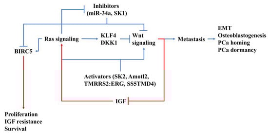Despite the diverse effects on PCa metastasis, Ras signaling and Wnt signaling are co-regulated by several upstream regulators. Rab25, a member of small GTPase that belongs to the Ras superfamily, is known as a direct activator of Ras signaling and Wnt signaling in various cancers, including hepatocellular carcinoma and non-small-cell lung cancer, but not yet in PCa [154,155]. In PCa, the Rab expression level was found to be positively interlocked with malignancy and recurrence after a radical prostatectomy [156]. It is expected that Rab also plays roles in upregulating Ras and Wnt signaling in PCa metastasis. Angiomotin (Amot) is a component of tight junctions that are important for maintaining apical/basal polarity in epithelial cells [157]. In various types of cancer, Amot promotes cell proliferation and alleviates metastasis through elevating MAPK expression and reducing β-catenin [157]. In PCa, Amot was proven to regulate cell growth via the Hippo/YAP signaling pathway, which is downstream of Wnt signaling [158]. Accordingly, Amot might contribute to co-regulating Ras and Wnt signaling in PCa cells. Chen et al. illustrated that miR-34a acts as a tumor suppressor in PCa through downregulating both TCF7 and BIRC5, which are Wnt and Ras signaling effectors, respectively [159], suggesting an interplay between WNT signaling and miR-34a expression in Ras-activated PCa. Other upstream regulators, like sphingosine kinase 1/2 (SK1/2) [160], the TMPRSS2:ERG fusion mutation [161], and ss5TMD4 [162], were demonstrated to modulate both Wnt and Ras signaling. In conclusion, these aforementioned studies emphasized the tight crosstalk between Ras and Wnt signaling in PCa metastasis and point to expected Ras/Wnt co-regulators that have been proven in other cancers. These mechanisms are critical for PCa metastasis, particularly in the osteoblastogenesis/osteoclastogenesis switch and EMT/proliferation switch.