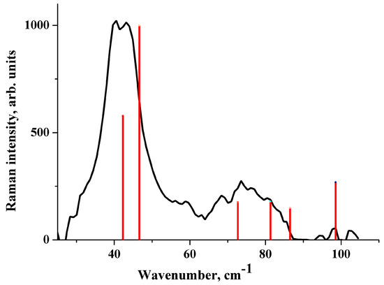 Raman spectrum of the CRB crystal in the region of 25–100 cm−1 (see text). Experiment (black line) vs. B3LYP(AtomOnly) computations (red bars). The height of the bars is proportional to the relative Raman intensity of the corresponding transition.