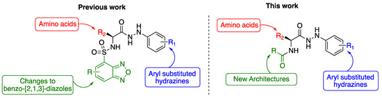 Our previous studies of benzoxa-[2,1,3]-diazole-substituted amino acid hydrazides demonstrated therapeutic selectivity of these molecules against mycolata over Gram-positive and Gram-negative bacteria [16]. This highlighted the involvement of the benzoxa-[2,1,3]-diazole, the amino acid (R2) moiety and the substituted aryl hydrazine (R1) towards bacterial selectivity, efficacy and establishment of a therapeutic index for development as a drug [16]. In this study, we evaluated variation of the benzoxa-[2,1,3]-diazole moiety within these compounds via the introduction of new architectures and their structure-activity-relationships toward the development of efficacious drugs against drug-resistant Mtb (Figure 2).