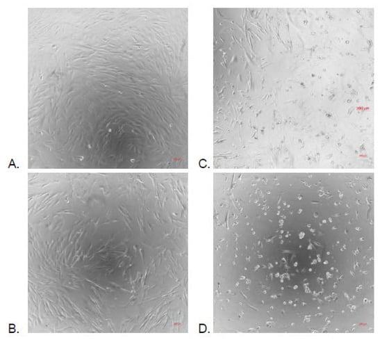 Microscopic observation of the effect of water Acacia seyal extract at different concentrations on MRC-5 cells at 24 hours. (A): DMSO control, (B): 64 μg/mL, (C): 128 μg/mL, (D): 256 μg/mL, observation under ×10 air objective.
