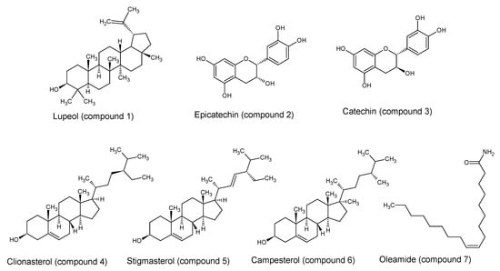 Four compounds were identified in the fraction F5 by GC-MS; three steroids as clionasterol (compound 4), stigmasterol (compound 5), and campesterol (compound 6); and one fatty acid as oleamide (compound 7) []. All structures are presented in Figure 2.