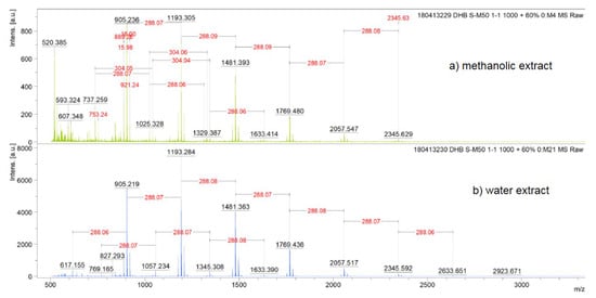 MALDI-TOF positive reflectron mode mass spectra of the condensed tannins from methanolic (a) and water (b) extracts of Acacia seyal bark.