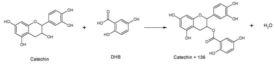 Esterification of catechin with the matrix molecule (DHB: 2,5 dihydroxybenzoic) during the MALDI-TOF experiment.