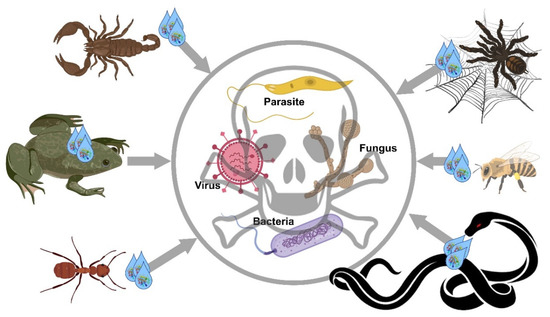 This review summarizes the recent findings on antimicrobial agents, mainly peptides (Table 1), but also whole venom or other components, derived from different venomous arthropods or vertebrates. These antimicrobial agents can target bacteria, fungi, parasites, or viruses (Figure 1).