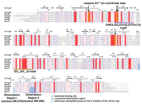 Sequence alignment for EcYjgB, HpCAD, EcYahK, SbCAD, PtCAD, and Nerol. Sequences of EcYjgB, Escherichia coli BL21 (DE3) YjgB (B21_04099); HpCAD, Helicobacter pylori cinnamyl alcohol dehydrogenase (PDB code: 3TWO); EcYakK, Escherichia coli BL21 (DE3) YahK (PDB code: 1UUF); SbCAD, Sorghum bicolor cinnamyl alcohol dehydrogenase (SbCAD) (PDB code: 5VKT); PtSAD, Populus tremuloides SAD (sinapyl alcohol dehydrogenase) (PDB code: 1YQD); Nerol, Yersinia pseudotubercluosis IP32953 nerol dehydrogenase (PDB code: 5Z0C) are aligned. Sequence identities for EcYjgB are 30.4% (HpCAD), 35.9% (EcYakK), 35.0% (SbCAD), 35.9% (PtSAD), and 34.7% (Nerol), respectively. Down arrows, and purple and golden under-bars indicate catalytic Zn2+ ion coordinate sites, GHEX2GX5(G/A)X2(I/V/A/C/S), and GX1–3GX1–3G motif, respectively. Green downside and blue upside triangles indicate substrate-binding sites and the amino acids important for selecting the phosphate group on the 2′ position of the ribose ring in nicotinamide adenine dinucleotide phosphate (NADP). Sky blue boxes represent conserved dimerization region. This multiple sequence alignment was performed using Clustal/W and prepared with the ESPript software package [20,21].