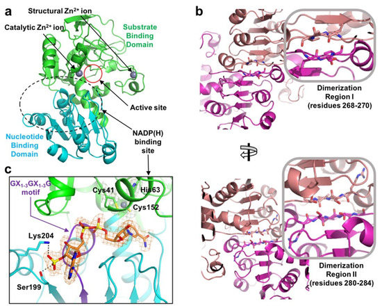 Structure of Escherichia coli YjgB (EcYjgB). (a) Overall structure. (b) Dimeric interface of EcYjgB. In the outcome of the Proteins, Interfaces, Structures, and Assemblies (PISA) analysis, the dimeric chains are colored as salmon and purple [19] (c) NADP binding site. The SBD (substrate-binding domain) and NBD (nucleotide-binding domain) are represented as green and cyan, respectively. The 2Fo-Fc electron densities of NADP (orange), and zinc ion (grey) with its coordinated residues (green) are shown at the 1.0 σ contoured level with their corresponded colors. The GX1–3GX1–3G motif is indicated as a purple cartoon.